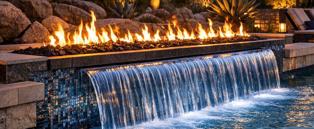 Cascading waterfalls, scuppers, boulder features, hidden fire bowls, LED lighting schemes, and hardscape landscaping create the resort atmosphere buyers seek, and each feature adds to labor and electrical work.