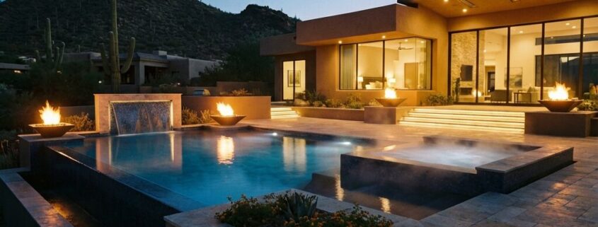 Upgrade to stone coping, glass tile accents, quartz decking, and color-stable plaster or pebble finishes designed for Arizona climates. These details matter for longevity and visual impact.