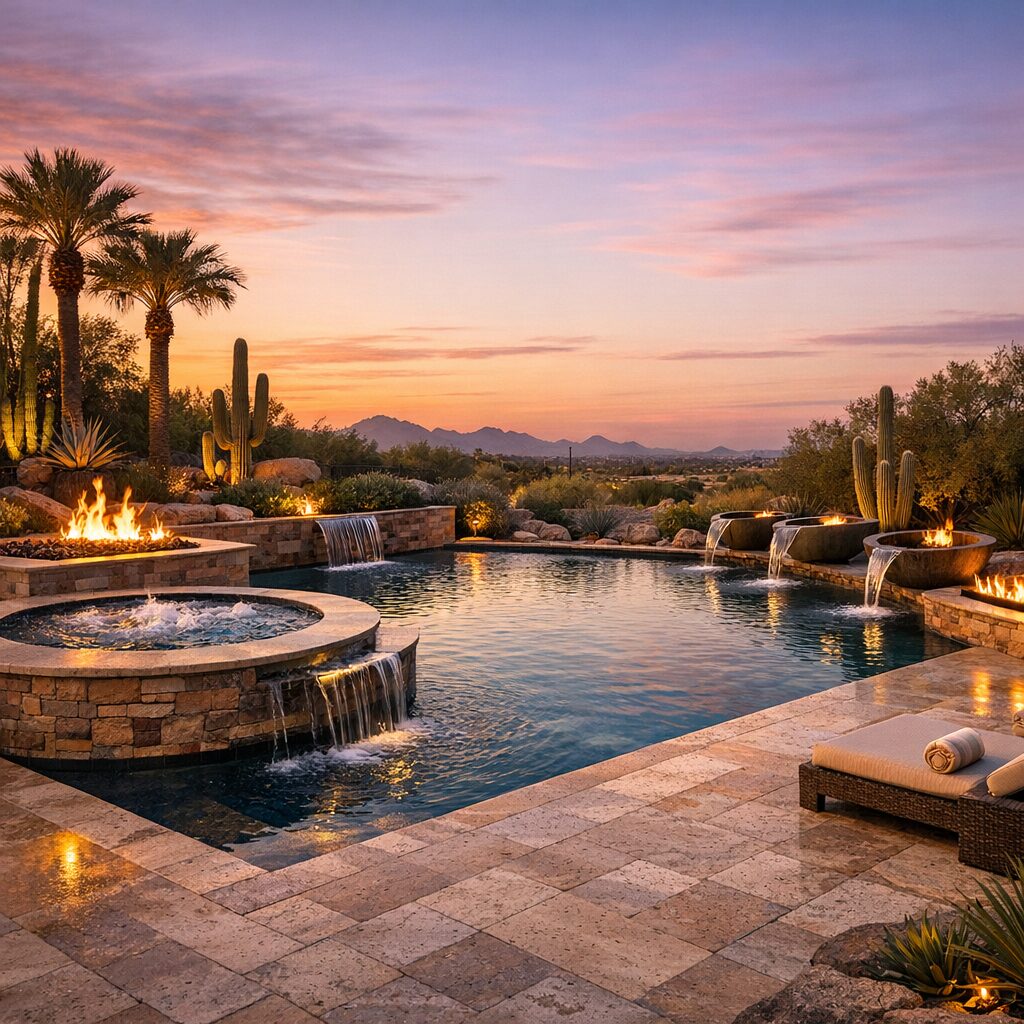 Natural stone, durable porcelain tile, and salt-friendly finishes handle Arizona sun and low humidity well. Non-slip decking and UV-resistant lighting fixtures are important choices.