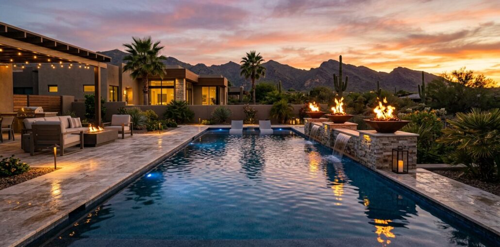This combination is especially effective in desert climates, where evening use matters. A thoughtfully designed feature can extend your outdoor season, elevate gatherings, and make your backyard feel finished in a way that simple pool upgrades often cannot.